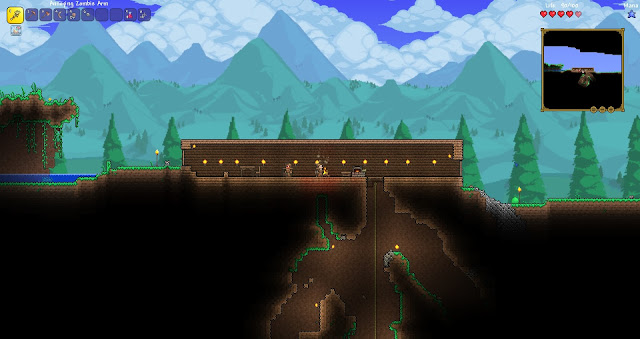We settled on Terraria. For those that don’t know, open-world building games are not a forte, nor a favorite, of mine. I’m not fond of the digging and general exploration, and I just don’t enjoy building. I’m never happy with what I build, so I get emo and then just turn it off.